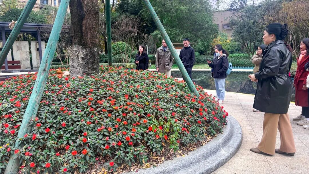 参会人员走遍了项目的每一个重要节点,查看草花的栽种方式是否合理——部分区域因土壤过湿出现植物烂根的迹象,这让团队意识到排水系统改善的紧迫性;观察植物生长状态是否良好——也发现因花卉选择不当,存在部分品种适应性差、需要频繁更换的情况,科学选种的重要性再次被强调。